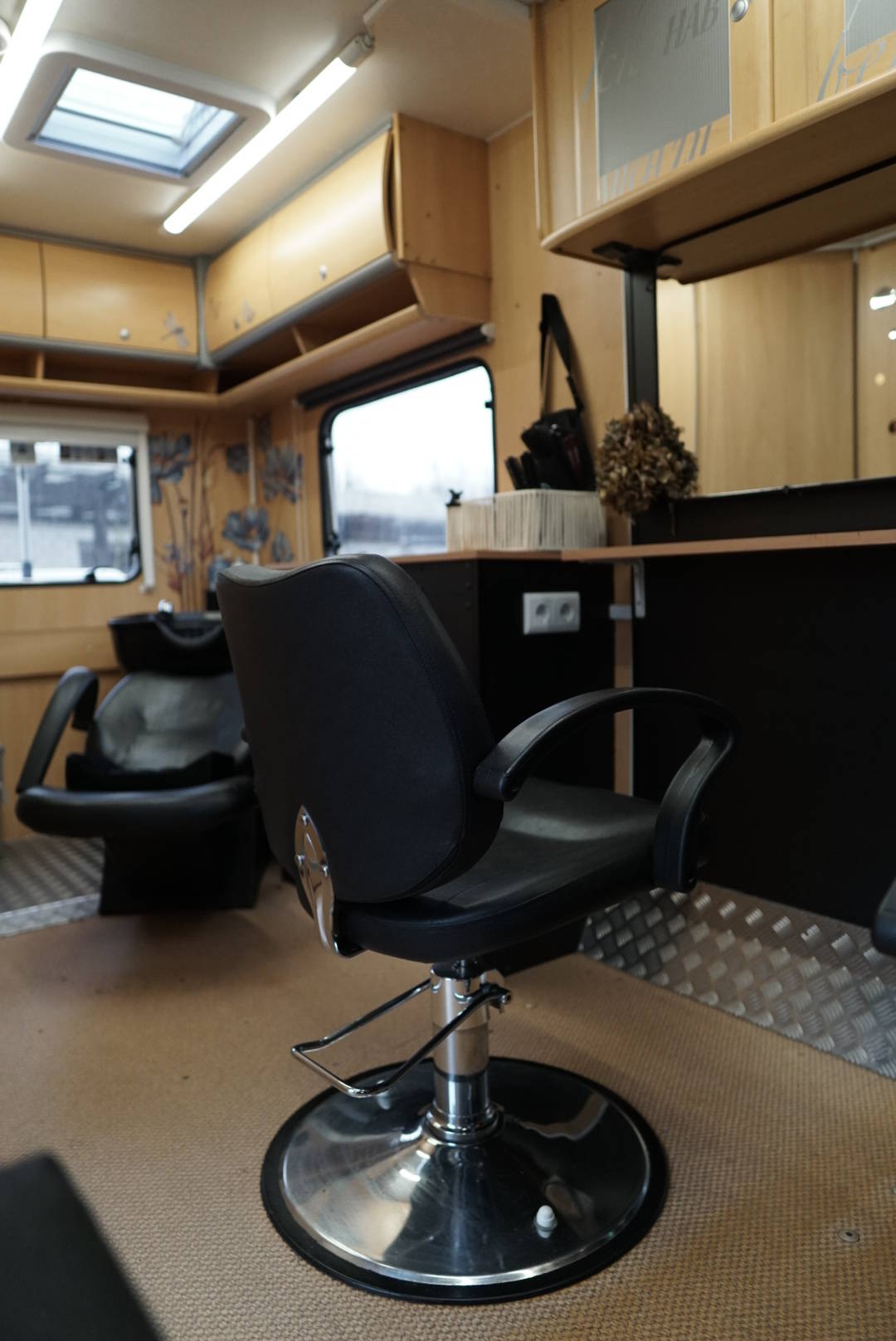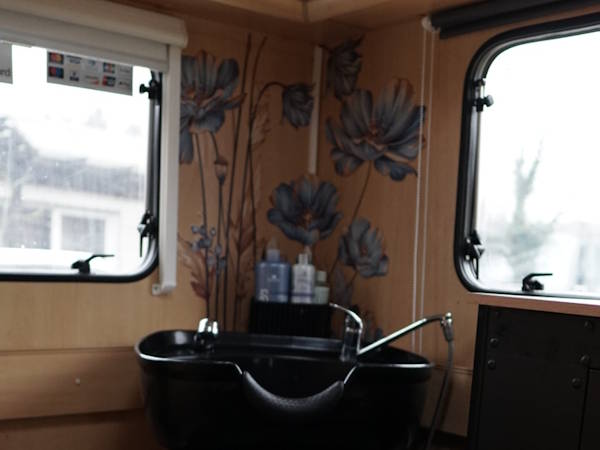 Mein mobiler Salon ist komplett eingerichtet (Heizung, Wasser) und bietet dank dem Rückwärtswaschbecken und den beiden Plätzen alle gewohnten Annehmlichkeiten in einer geschützten und privaten Atmosphäre.